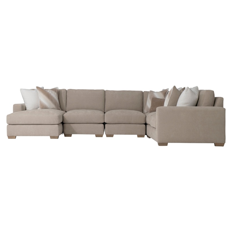 5-piece sectionalFiber back pillows and Plush feather down seat cushions7 toss pillowsWheat finishThe Dawkins sectional offers casual comfort with a high-end look. The timeless modern design features wide track arms and tapered block feet, available in a v