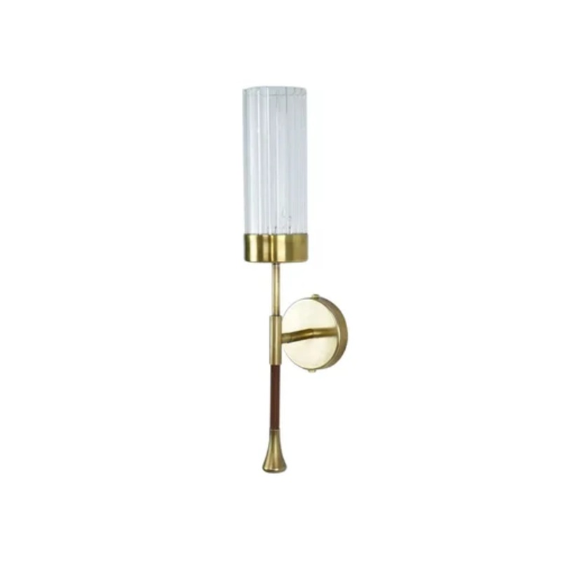 A timeless wall light built in a solid brass structure highlighted by a leather sheathed stem and a cylinder textured glass shade. Available as a single or double fixture.