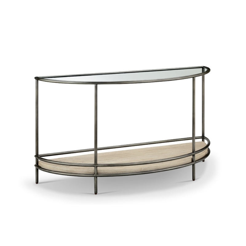 Elevate your space with a stunning collection of mixed media, pulling together a warm modern flare. The rounded shaping of both the frame and metal accents brings a softness to the hard elements. Glass top creates a nice open ambience allowing light to pass through to the wire brushed pine shelf. Play on finish with the natural pine and vintage bronze metal finish creates good contrast directing your eye to flow around the table and see all the details! Standout features include a nesting end table for added convenience and space-saving, a round cocktail table that serves as a centerpiece, and a demilune sofa table that adds a touch of elegance to any entryway. Make a statement in your home with this sleek and stylish collection.