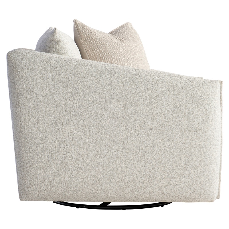 Swivel baseFlange edgeThrow pillowThe Demi swivel chair takes a traditional design and updates it with modern details. Slimmer arms are refined with a flange edge. The seat cushion, back pillow and curated throw pillow are casual and deeply comfortable. An