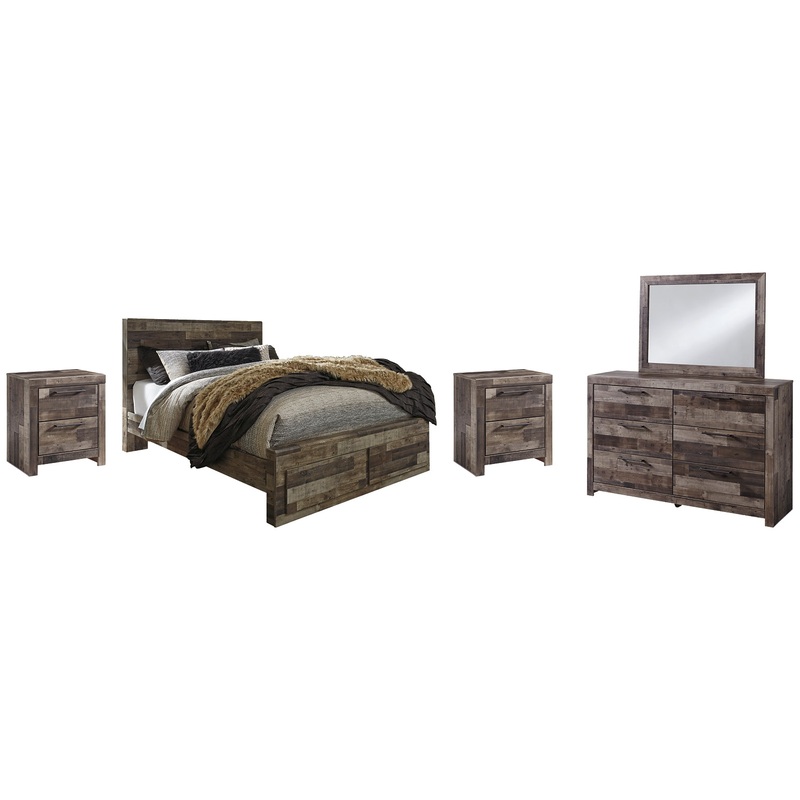 Derekson Queen Panel Bed with 2 Storage Drawers with Mirrored Dresser, Chest and Nightstand