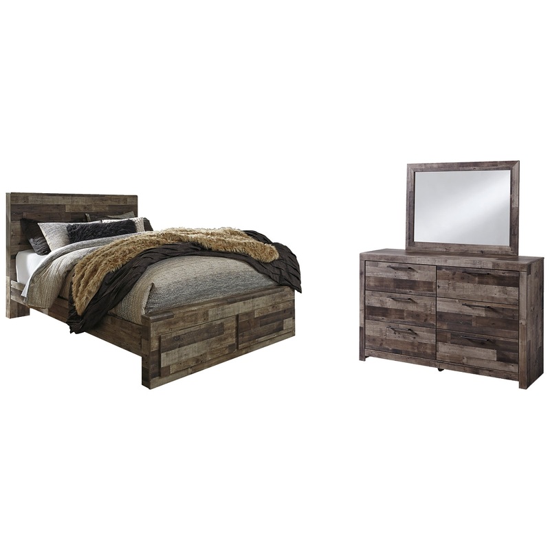 Derekson Queen Panel Bed with 2 Storage Drawers with Mirrored Dresser
