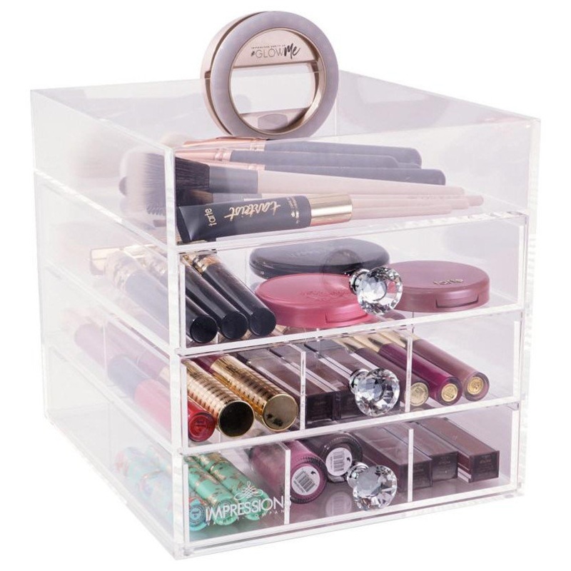 Impressions Vanity Diamond collection petite 4-tier acrylic makeup organizer with an open top is made with high-quality crystal-clear acrylic with luxurious diamond-style knobs, they are the perfect companions to our Hollywood Vanity Mirrors.. This profess