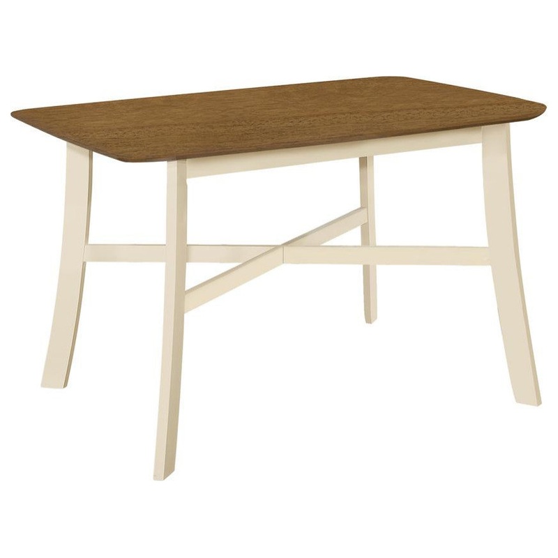 Introducing our stylish and versatile oak and cream dining table the perfect addition to any kitchen or dining room. This 48 rectangular table is designed with small spaces in mind ensuring it fits seamlessly into your home. Crafted with an oak veneer easy to clean top with slightly rounded corners this transitional dining table exudes a fashionable style that effortlessly complements any decor. The sleek cream finish adds a touch of elegance while the sturdy angled wood legs with cross bar supports ensures longevity. Not only is this dining table durably designed but it also comes with a 2 year limited warranty giving you peace of mind in your investment. Assembly is a breeze with our easy-to-follow illustrated instructions allowing you to enjoy your new dining table in no time. Comfortably seating up to 4 people pair this table with some matching chairs sold separately and you will be all set for some casual family dining or entertaining.