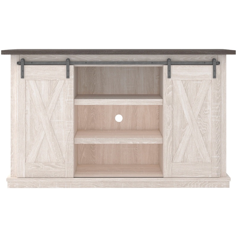 With its two-tone finish, cross-buck details and authentic charm, this TV stand is right in tune with your relaxed approach to high style. Beautifully made to accommodate your media equipment, it’s well equipped with adjustable shelving, cutouts for wire management and, of course, a pair of sliding barn doors you can center or place to the side. What a mastery in modern farmhouse living. – Product Details provided by Manufacturer, Slumberland not responsible for errors in information.