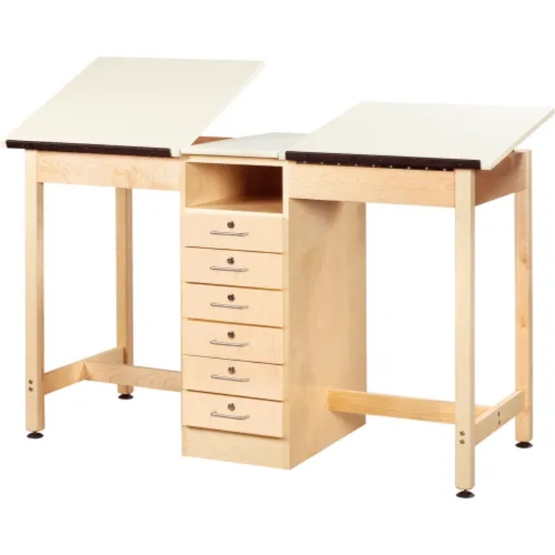 Two-station drawing table with six drawers Plywood cabinet withsolid maple apron and legs make this the perfect table for everyday use by two students. Center cabinet has six dovetailed locking drawers (10-1/2"W x 19-3/4"D x 3-1/4"H) and a book compartment