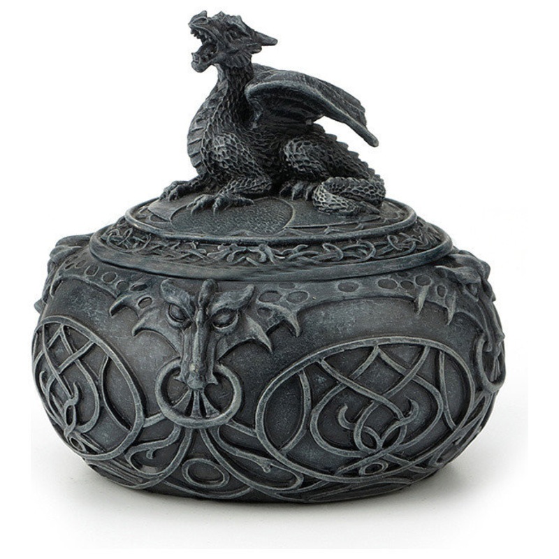 Show off your ferocious or untamed side with this Dragon Globular Shaped Trinket Box from XoticBrands. This stunning trinket box is made of high-grade polystone and hand-painted in the grey hue that lends it a vintage look. Whatever you will stow in this box; it will get the powerful protection of the fierce dragon sitting atop of its lid. The round base also shows dragon faces and adorned with the intertwined pattern of sleek lines. Stow your keys, or vintage treasures in this unique piece of excellent artwork and keep them new and clean for years to come.Category: Trinket Box Made of PolystoneMeasures 3.94(L) x 3.94(W) x 3.74(H) Inches,Weighs 1lbs