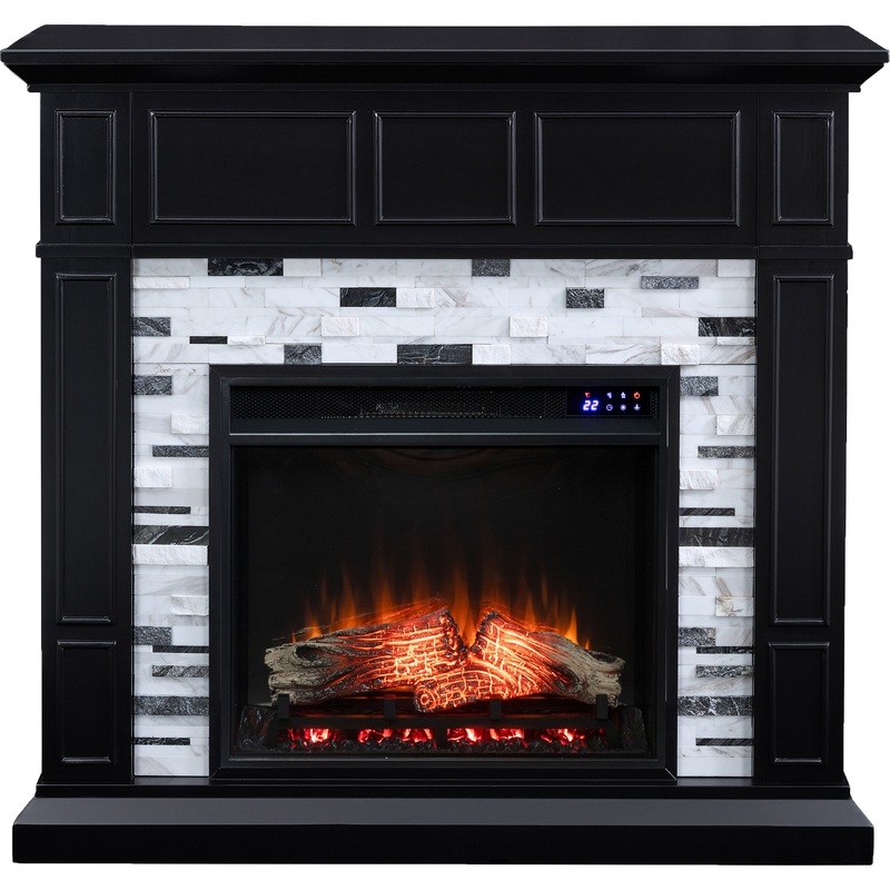 Upgrade your modern living space with this authentic marble electric fireplace mantel. Glowing faux fire logs add ambiance with flickering LED flames and lifelike embers, with or without heat. Handsome woodwork complements a patterned marble surround, bloc