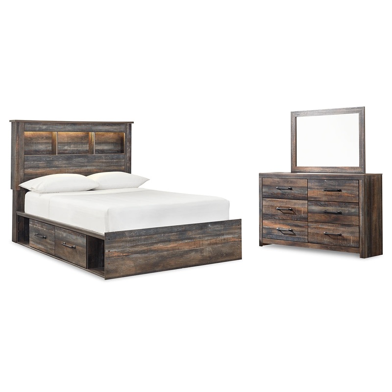 This full-size bookcase bed with storage, dresser and mirror is a refined take on barn board beauty. Its complex, replicated wood grain showcases hints of burnt orange and teal tones for a sense of weatherworn authenticity. Three open cubbies lined with a dimming LED light strip keep bedtime reads top of mind while underneath the bed is four smooth-gliding drawers and four open cubbies that accommodate casually cool storage bins. The dresser with six smooth-gliding drawers lined with faux linen laminate and industrial dark-tone hardware complete this rustic and industrial style bedroom. Mattress and foundation/box spring available, sold separately.