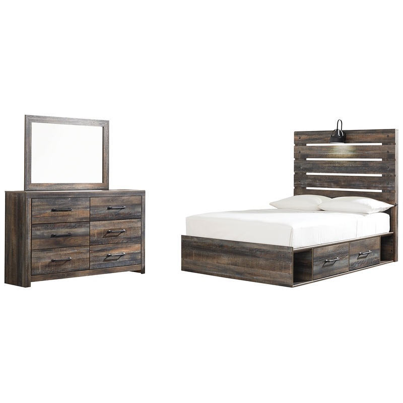 When merged in just the right way, rustic and industrial styles can make one happy marriage. Case in point: this bedroom set with storage bed and dresser/mirror. A refined take on barn board beauty, its complex, replicated wood grain showcases hints of burnt orange and teal tones for a sense of weatherworn authenticity. Love to read in bed? Youre sure to find the retro-chic light sconce and USB plug-ins on the open-slat style headboard such a bright idea. Underneath the bed: smooth-gliding drawers and open cubbies that accommodate casually cool storage bins. Elongated metal drawer pulls elevate the aesthetic.