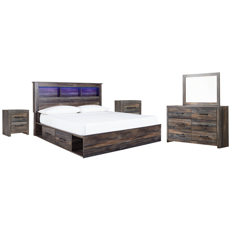 This king-size bookcase bed with storage, dresser, mirror and two nightstands is a refined take on barn board beauty. Its complex, replicated wood grain showcases hints of burnt orange and teal tones for a sense of weatherworn authenticity. Three open cubbies lined with a dimming LED light strip keep bedtime reads top of mind while underneath the bed is a pair of smooth-gliding drawers and two open cubbies that accommodate casually cool storage bins. The dresser and nightstand with smooth-gliding drawers lined with faux linen laminate and industrial dark-tone hardware complete this rustic and industrial style bedroom. Mattress and foundation/box spring available, sold separately.
