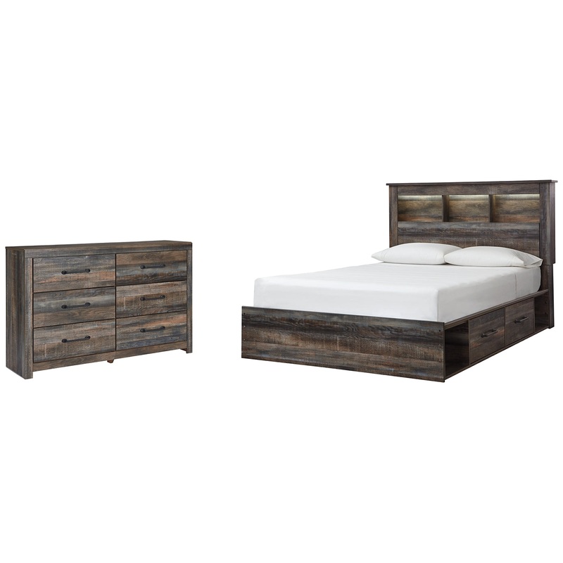 When merged in just the right way, rustic and industrial styles can make one happy marriage. Case in point: this bedroom set with bookcase bed with underbed storage and dresser. A refined take on barn board beauty, its complex, replicated wood grain showcases hints of burnt orange and teal tones for a sense of weatherworn authenticity. Love to read in bed? Three open cubbies lined with a dimming LED light strip keep bedtime reads top of mind. Underneath the bed: smooth-gliding drawers and open cubbies that accommodate casually cool storage bins. Elongated metal drawer pulls elevate the aesthetic.