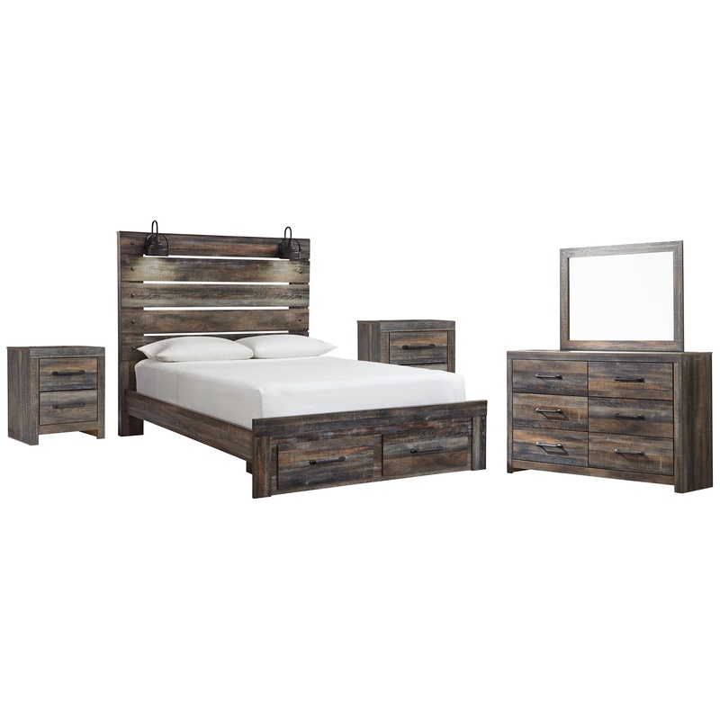 This queen-size panel bed with storage, dresser, mirror and two nightstands is a refined take on barn board beauty. Its complex, replicated wood grain showcases hints of burnt orange and teal tones for a sense of weatherworn authenticity. Love to read in bed? Youre sure to find the pair of retro-chic light sconces and USB plug-ins on the open-slat style headboard such a bright idea. Double drawers at the foot of the bed also come in mighty handy. The dresser and nightstands smooth-gliding drawers lined with faux linen laminate and industrial dark-tone hardware complete this rustic and industrial style bedroom. Mattress and foundation/box spring available, sold separately.