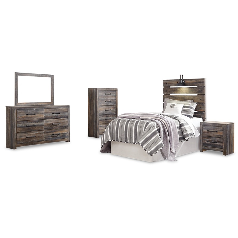 Drystan Twin Panel Headboard Bed with Mirrored Dresser, Chest and Nightstand