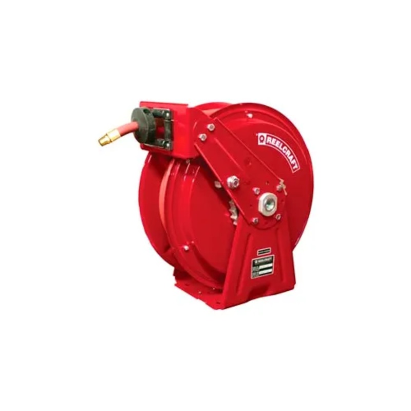 This 16-1/2″L x 9″W x 17″H dual pedestal reel is made with corrosion-resistant powder coated steel housing for long lasting durability. Hose anti-latch out feature ensures hose retracts every time. Guide arm is field adjustable for wall, ceiling, or truck mounting positions. Dual pedestal base and guide arm design, structurally reinforced. Five-in-one heat treated aluminum casting incorporates main shaft, ratchet, spring arbor and inlet/outlet plumbing in one piece casting. Containerized spring assembly. Provides safe and easy handling during maintenance. Two sealed ball bearings for smooth rotation of main shaft. Furnished with S.A.E. 100 R1T one wire braid hose.
