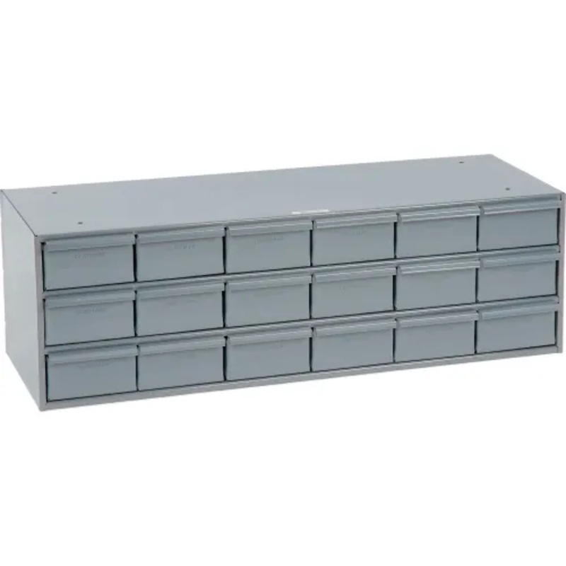 Sturdy Steel Parts CabinetStorage cabinets feature balanced, no-drag drawers with newly designed pulls and extra heavy construction. Drawers have 2 dividers which may be adjusted on 1" increments to provide desired size compartmentalization. Gray powder co