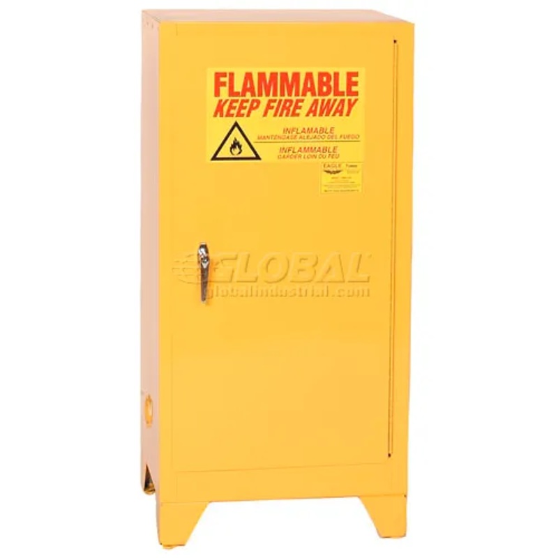 Eagle's 16 Gallon, manual close, Tower Space Saver Flammable Liquid Safety Cabinet is constructed of 18-gauge (1 mm) steel and has 4 in (10.2 cm) adjustable legs. The sides, top, bottom, and doors are double-walled with a 1-1/2 in (3.8 cm) air space betwee