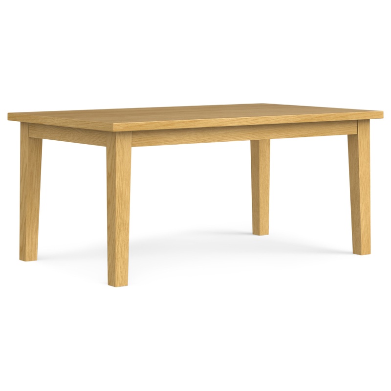 # Supporting the tabletop are extra-thick, solid oak wood legs with a square shape, and an inset table apron that adds a refined touch.