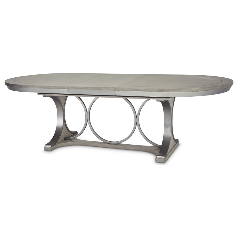 The definition of effortless modern style! The Eclipse Oval Dining Table brings a balance of smooth wood finishes and striking stainless steel accents. With one leaf included, this table is perfect for small dinners and family parties alike!