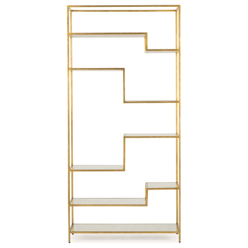 A smart shelving unit in a gold effect satin brass finishes, with eglomise glass shelving. Showcase your treasured ornaments and literature with this striking sculptural piece with silver leaf eglomise glass shelving. -W40 x D18 x H84 in, Weight 150lbs -W1