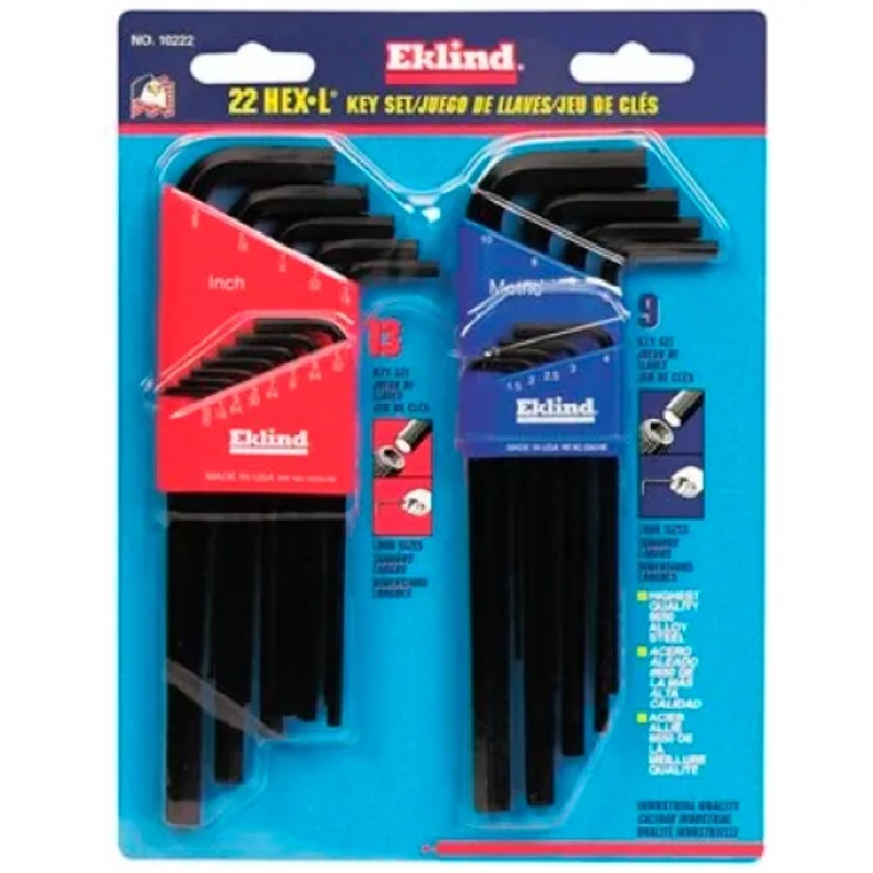 Eklind 10222 .05-3/8" & 1.5-10MM 22Pc. Metric & SAE Hex Key SetFeatures:Produced from 8650 Chrome Nickel Alloy SteelHeat treated for superior strengthHex corners are sharp & cleanFinished to resist rustColor coded compact holdersIncludes: Plastic Holders0.