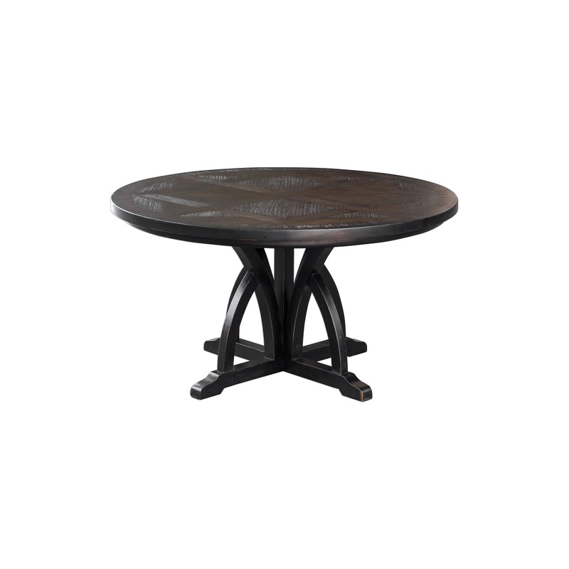 Soft, Weathered Black Finish On Solid Mango Wood Arched Motif Base, With Rub-through Distressing On The Mindi Veneer Inlay Top. 56″ Size and Central Pedestal Allow Seating for 4 to 6.