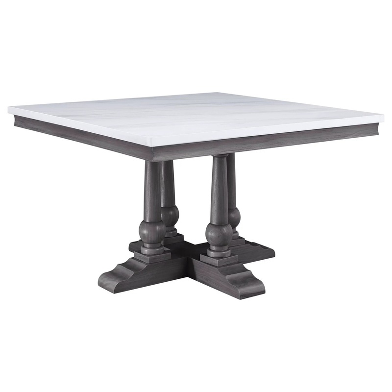 -This dining table has a pedestal base which gives its tabletop both sturdy and elegant support -Square tabletop in white artificial marble -Wooden base with turned supports -Floor clearance: 27" -Weight capacity: 200 lbs -Dimensions: 48" x 48" x 30" In. -