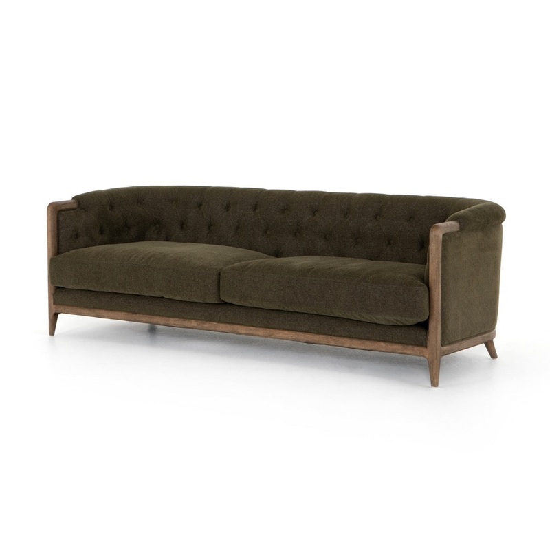 Dress the room with Parisian vibes. With traditional button tufting and classic rolled arms, feather-blend seating is upholstered in a deep, earthy olive performance fabric for a warm, regal look, with exposed parawood framing for a natural touch. Performa