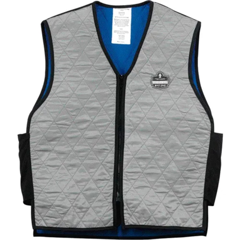 Evaporative Cooling Vest: Soak in cold water, and enjoy cooling relief and comfort. V-neck with zipper closure Quilted nylon outer layer Activated, polymer-embedded fabric inside Water-repellent liner and black cotton-poly elastic trim Lightweight, durable