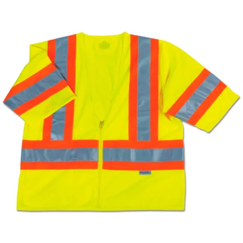 Class 3 Two-Tone Vest: Solid, Zipper closure.ANSI-certified polyester mesh (3.3 oz.)Zipper closure3M Scotchlite Reflective Material, 2 Level 2 ANSI-certifiedPockets: One insideLime, OrangeTape set on 4.5 contrasting color background