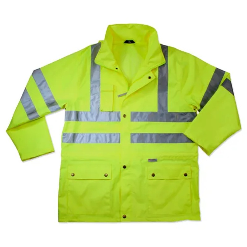 GloWear 8365 Class 3 Rain Jacket, Lime, X-LargeClass 3 Rain Jacket: Breathable poly shell keeps the rain out while letting perspiration escape Weatherproof outer shell constructed of 300D oxfordBreathable PU coatingPolyester mesh liningYKK #5 Zippers3M Sco
