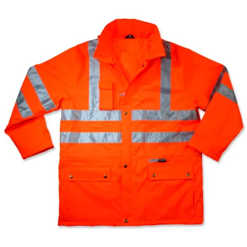 GloWear 8365 Class 3 Rain Jacket, Orange, 3-X-LargeClass 3 Rain Jacket: Breathable poly shell keeps the rain out while letting perspiration escape Weatherproof outer shell constructed of 300D oxfordBreathable PU coatingPolyester mesh liningYKK #5 Zippers3M