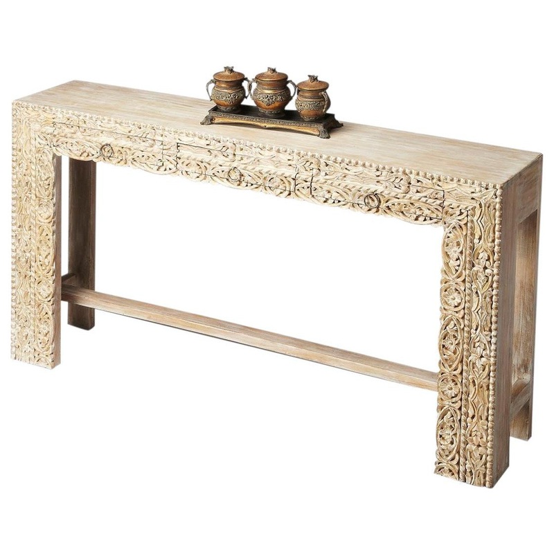 Elevate your home’s interior with the uniquely crafted Janta Console Table from the renowned Butler Specialty Company. Part of their Artifacts Collection, this exquisite table features hand-carved detailing made from premium mango wood solids and recycled wood, ensuring each piece is as environmentally conscious as it is beautiful. At 32 inches in height, 55.50 inches in width, and 11.50 inches in depth, this console table is the perfect blend of form and function. Its transparent washed finish enhances the natural beauty of the wood, while the intricately carved front adds a touch of artistic flair, making it a true centerpiece in any room. This transitional-style console table’s neutral Artifacts white color outputs a fresh and inviting look, making it versatile enough to complement both traditional and contemporary decors. Ideal for entryways, hallways, or living spaces, it provides a sophisticated surface for displaying your treasured collectibles or family photographs. Combine practicality with artfulness by introducing this striking piece into your home decor. Witness firsthand the harmonization of design and functionality that this table delivers. – Dimensions: 32H x 55.50W x 11.50D – Condition: New – Material: Mango Wood and Recycled Wood – Color: Artifacts White – Style: Transitional – Eco-friendly handcrafted design – Manufacturer: Butler Specialty Company