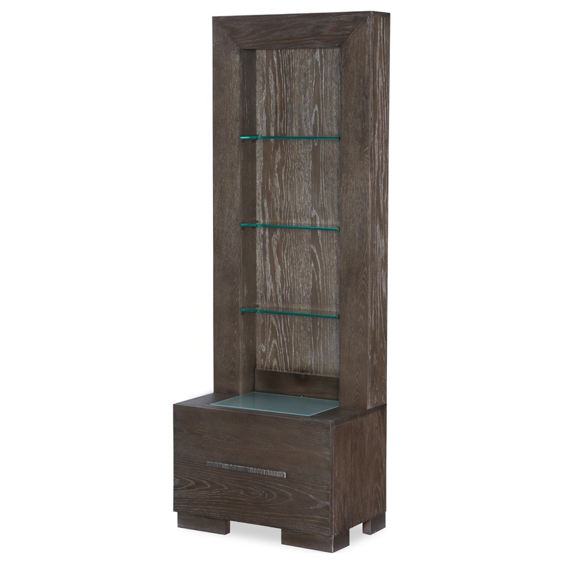 Pier only. 1 Drawer, 3 Fixed Glass Shelves, 3-Way Touch Lighting Facets is a casual contemporary, total home collection offering multiple bedroom, dining and occasional options. Styling such as inset-framed drawers, faceted design elements, geometric shapes and veneer work give this collection a higher end tone, but in a more casual and relaxed way aimed at today’s lifestyles. The White Oak veneers are finished in a Mink color with silver undertones that add just a touch of highlighting for the deep grain patterns and plays off of the Polished Nickel textured bar pulls. Facets offers form, function and quality that Legacy Classic is known for. Select Hardwoods, White Oak Veneer and Mink w/Silver Undertones Finish with Polished Nickel Finished Bar Pulls