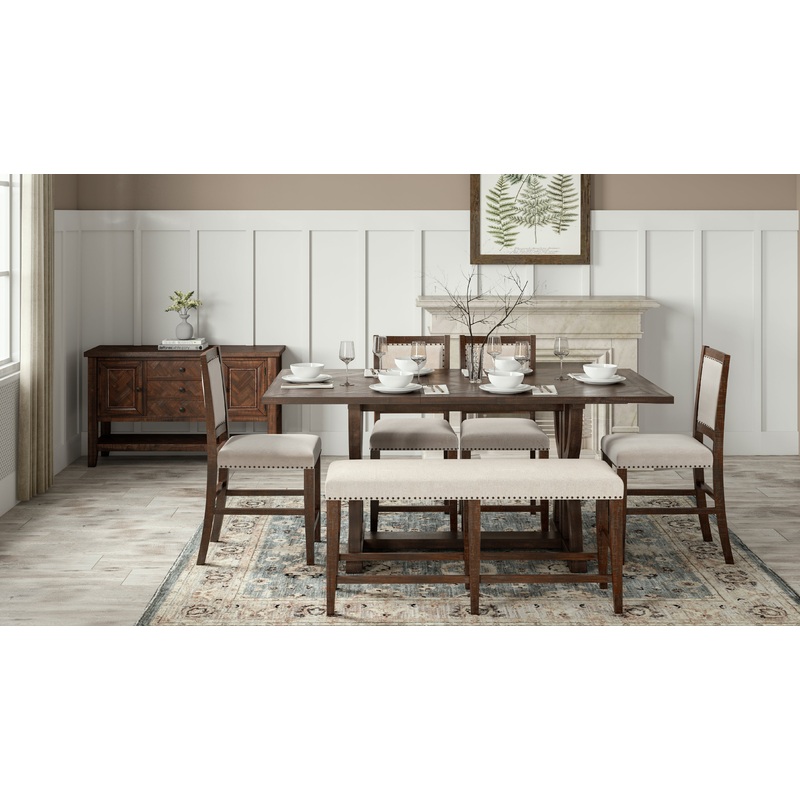 Stand out with the Fairview Dining Collection. The table is the show stopper with beautiful open work scrolling detail and a stunning chevron table top design. This is the counter-height table with light distressing and an extension leaf.