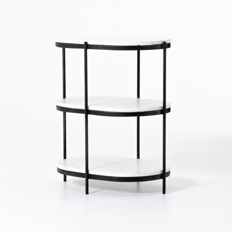 Add a pop of sophistication to any space. Polished white marble lays three tiers of oval-shaped shelving, with powder-coated grey iron framing bringing a feminine feel to bedside storage.