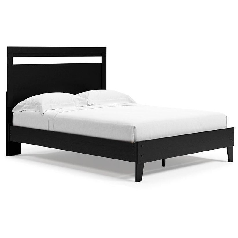If youre a fan of clean, crisp and contemporary interiors, rest assured this queen panel platform bed suits you. Its linear profile is enhanced with a matte black finish with subtle replicated wood grain. The headboard's peekaboo cutout adds a cut-above el