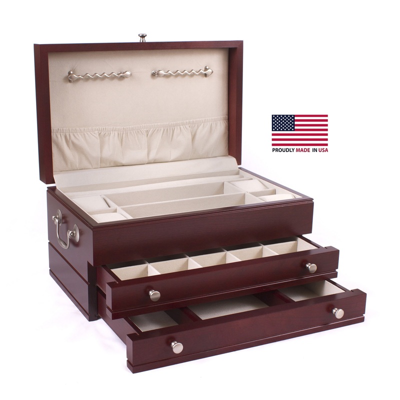 First Lady Jewel Chest, Solid American Cherry Hardwood with Rich Mahogany Finish. Double swing out chain bars in lid for ease of access to chains, with pouch. Drawer pulls and side handles are brushed nickel. Top deck includes ring rolls, pillows, multiple compartments. Top drawer has 18-separate earring/ring compartments. The bottom drawer has large bangle/bracelet compartments.