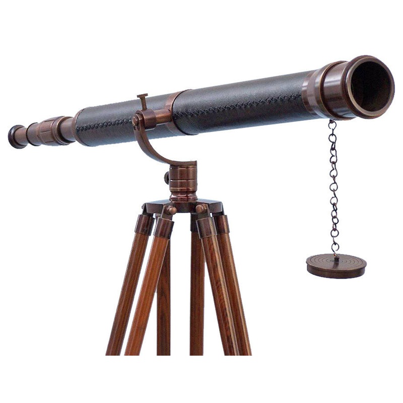 The Hampton Nautical Floor Standing Bronzed With Leather Galileo Telescope 62″ is by far our standout choice amongst nautical enthusiasts worldwide.Constructed from all Bronze, refractor telescope mounted on a wooden tripod. This telescope is a fully functioning nautical masterpiece that adds class and sophistication to any room its in. This is a perfect gift for the nautical explorer, an appropriate piece to spruce up an office for the busy executive, or perfectly position this exquisite telescope by your window sill to stargaze. The main scope is bronzed, which shines beautifully when placed in the sunlight. Focusing is accomplished by adjusting the eyepiece ring on the telescope tube, with up to 15x magnification. A removable bronzed cap, connected by a chain, protects the objective lens.–The wooden tripod stand features smooth, polished round legs, each with bronzed fittings and a screw release to let you adjust the height. A bronzed chain holds the three wooden legs together so the telescope can maintain its position.–Dimensions: 30″ Long x 24″ Wide x 62″ High— 15X Magnification — Bronzed telescope body– Glass optics for a clear view (not plastic lenses)– Fully functional telescope focuses and magnifies– Sturdy wooden tripod supports telescope when viewing– —