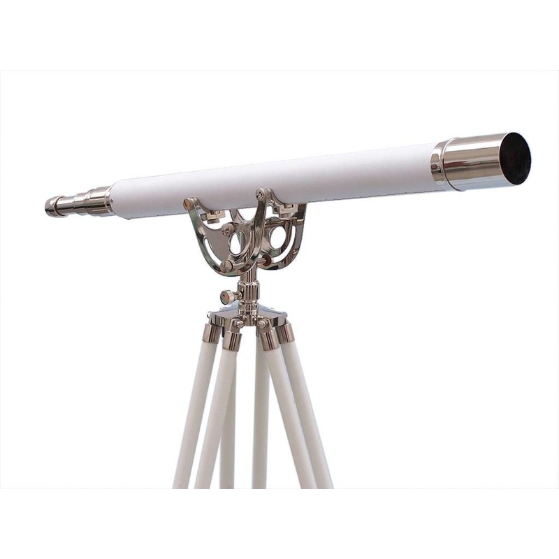 The Floor Standing Chrome with White Leather Anchormaster Telescope 65'' is a beautiful, refractor telescope mounted on a wooden tripod. This telescope is a fully functioning nautical masterpiece that adds class and sophistication to any room it's in. This
