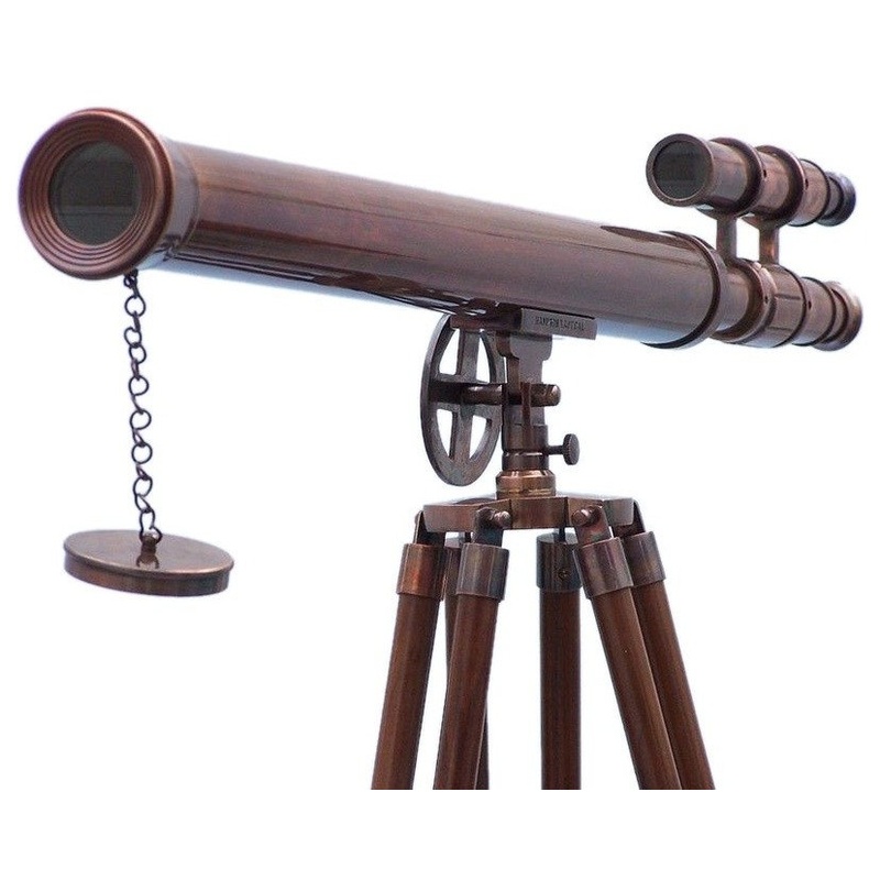 The Floor Standing Antique Copper Griffith Astro Telescope 64” with view finder is the pinnacle of our wide telescope selection. This beautiful antique copper finish telescope is mounted on a wooden tripod. The objective lens is 42mm. This telescope is a beautifully functioning nautical masterpiece, with a 42mm objective lens that produces up to 15x magnification. Focusing is accomplished by adjusting the eyepiece ring on the telescope tube. This antique copper nautical gem adds a shine to any room it enters. A removable antique copper finish cap, connected by a chain, protects the objective lens.–The wooden tripod stand features smooth, polished and round legs, each with metal fittings and a screw release to let you adjust the height. A antique copper chain holds the three wooden legs together so the telescope can maintain its position. — Dimensions: 64” H x 25” W x 32” L—- 15X Magnification– Polished telescope has a vintage antique copper finish– — Glass optics for a clear view (not plastic lenses)– Fully functional telescope focuses and magnifies– Sturdy wooden tripod supports telescope when viewing– Custom engraving/photo etching available: Logos, pictures or slogans can be easily put on any item. Typical minimum custom order is 100+ pieces. Minimum lead-time to produce and engrave is 4+ weeks. Custom engraving available on large quantity orders (call us for information)–