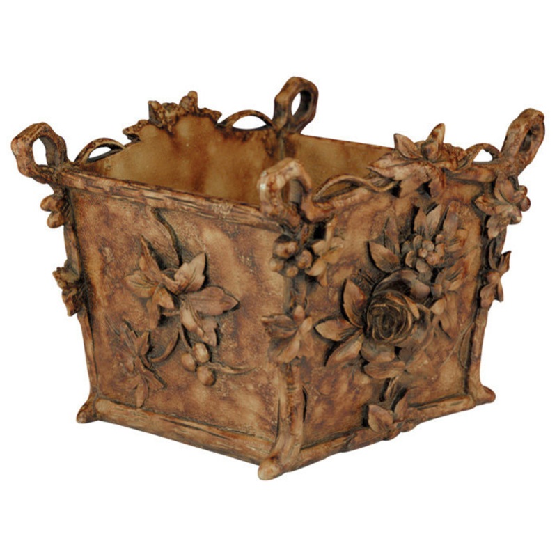This lovely Floral Basket Box Planter is a rustic style honey maple highly carved box planter suitable for any floral tabletop center piece. It measures 9 inches wide, 7 inches deep, and 7 inches high, and is made of resin. This gorgeous piece is perfect f