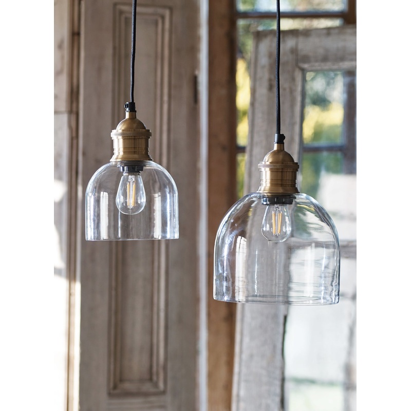 - Small hand blown domed pendant light - Clear glass shade with holder crafted from solid brass - Suspended with a coordinating ceiling rose and a black fabric cable- Try suspending low as an alternative to a bedside lamp