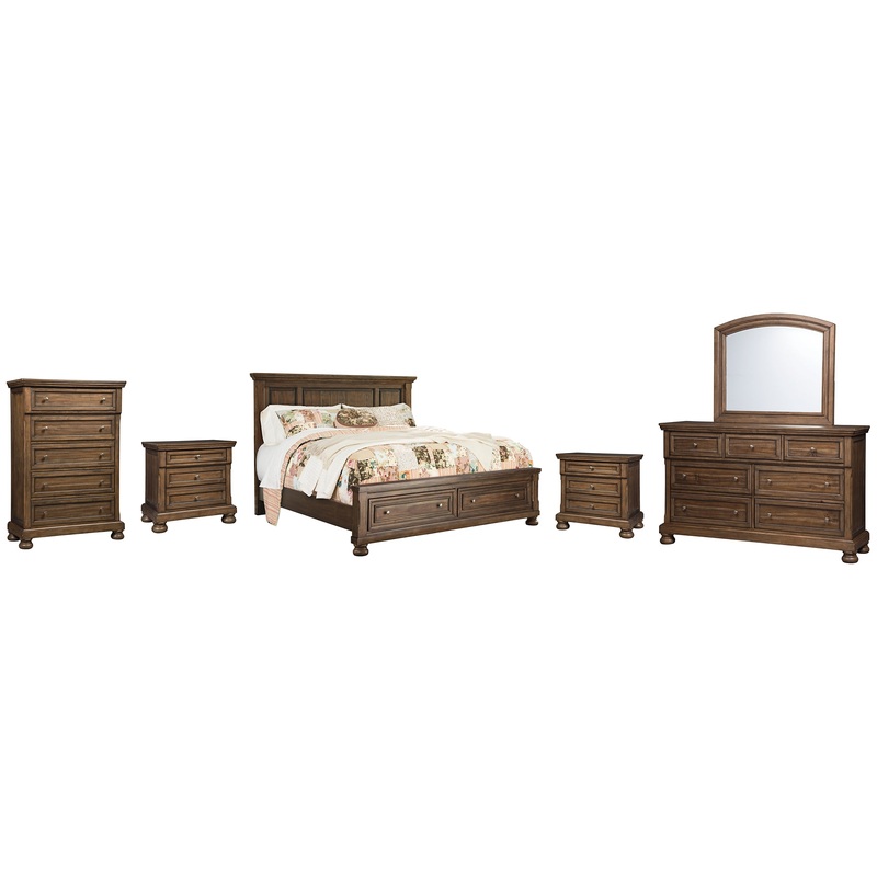 Flynnter California King Panel Bed with 2 Storage Drawers with Mirrored Dresser, Chest and 2 Nightstands