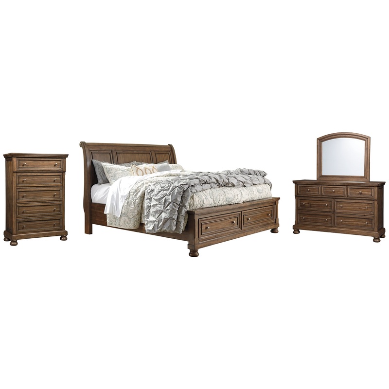 Flynnter King Sleigh Bed with 2 Storage Drawers with Mirrored Dresser and Chest