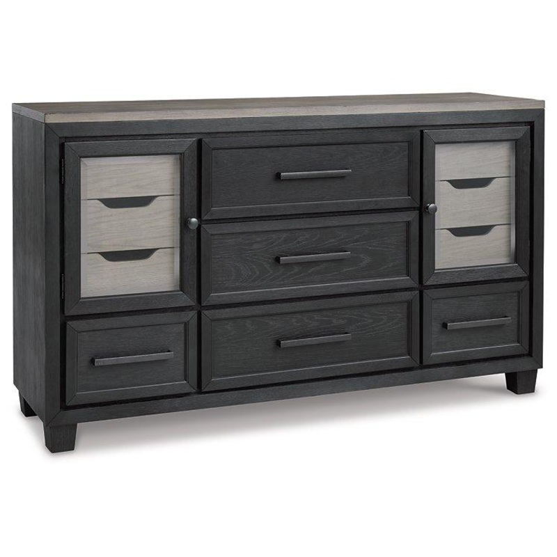 This dresser is casual contemporary style simply done right. Its two-tone color scheme features a rich brushed black main color accented with a beautiful dusty grayish brown wood tone. With 11 soft-close drawers (three located neatly behind each door) this dresser offers plenty of storage to accommodate your wardrobe needs with ease.