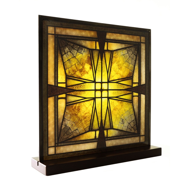 On this glass panel, enamel colors are individually applied to a single sheet of glass which is then kiln fired to permanently fuse the enamels to the glass. The glass panel is then framed with a metal came and includes hanging chain and wood stand for optional desk or table display. Ht: 10. W: 10. This Frank Lloyd Wright glass panel is officially licensed by the Frank Lloyd Wright Foundation.