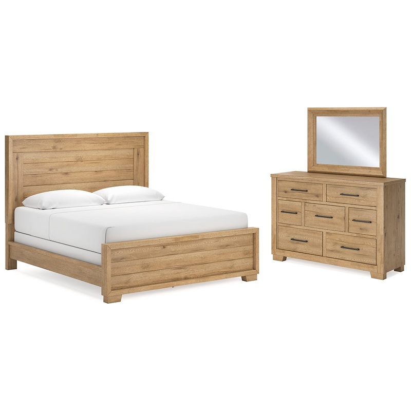 | Details | B841B5: Includes panel headboard and footboard with rails, Made with hardwood solids and thick rustic oak veneer, Glazed natural light oak color finish enhances the natural characteristics of the veneer, Thick metal bar pulls with a hammered textural surface in an aged bronze-tone finish, Foundation/box spring required, sold separately, Mattress available, sold separately, Natural wood may display natural weathering, unique cracks, splits, knots, saw marks or other organic features unique to each piece, Assembly required, B841B1: Includes dresser and mirror, Made with hardwood solids and thick rustic oak veneer, Glazed natural light oak color finish enhances the natural characteristics of the veneer, Thick metal bar pulls with a hammered textural surface in an aged bronze-tone finish, 7 drawers with fully finished interior, dovetail construction and ball-bearing side glides, Natural wood may display natural weathering, unique cracks, splits, knots, saw marks or other organic features unique to each piece, Mirror attaches to back of dresser, |