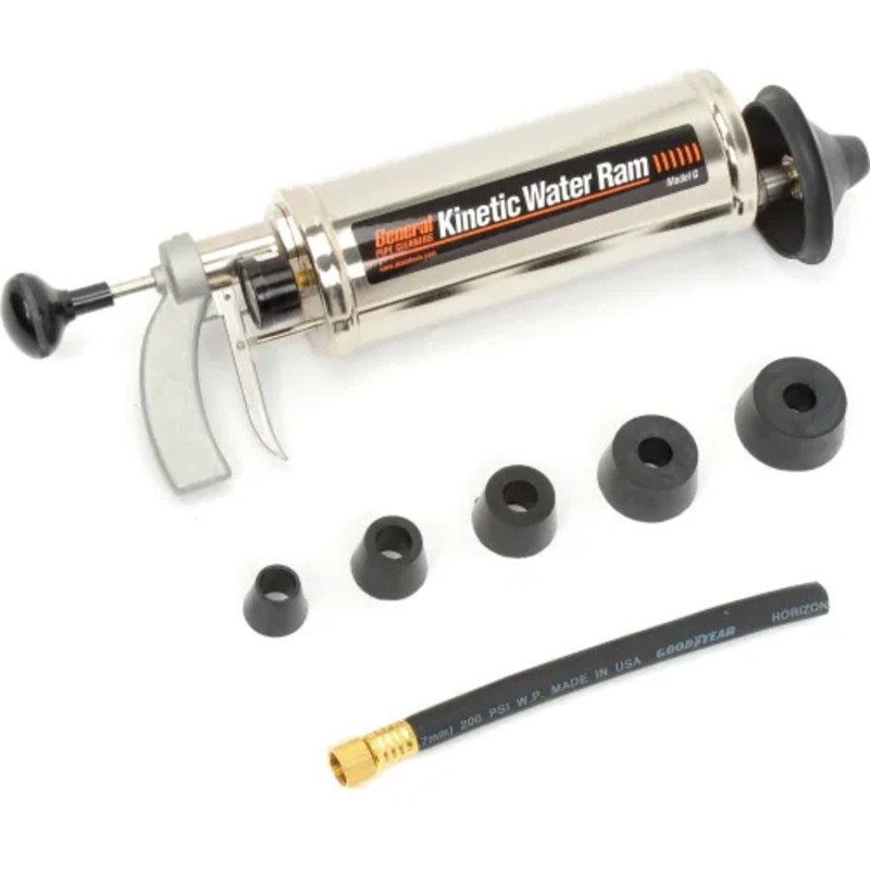 General Wire Kinetic Water Ram Pipe Cleaners w/ 4" Cone, (5) Plugs, Caulking Hose & Carrying Case Here's a compact, lightweight tool for quickly opening clogged sinks, toilets, and tubs. It handles rust, grease, sediment, and scale in lines up through 4" i