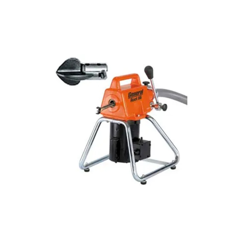 The Root 66 is a real advance in sectional cable machine design. No mid-range machine has its versatility and power. Look at its versatility. You can drive 5/8″ cables for lines up to 3″ and 7/8″ cables for 4″ lines – and you can switch from one to the other in seconds, without touching the jaws, without an adapter, without tools. And for sink drainwork, slip on a drum that holds smaller cables. To operate, just feed a cable into the line and slide the back end into the machine. The excess cable goes into a guide tube. Turn on the sealed motor, press down on the handle,and the Root 66 starts spinning the cable at 400 rpm. The cable stops rotating as soon as you lift the handle, so there’s no additional torque buildup. When using a drum for small drain work, the drum stops turning when you lift the handle to the neutral position. The Root 66 has a wide four point base for greater stability. Its interlocking tubular construction also gives it excellent durability. To protect the gears from dirt and for easier cleaning, the machine has two internal plastic shields. A Ground Fault Circuit Interrupter is standard equipment. Store cutters in the included tool box.